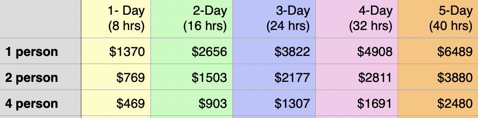 (Based on a minimum of 4 participants & max of 8))